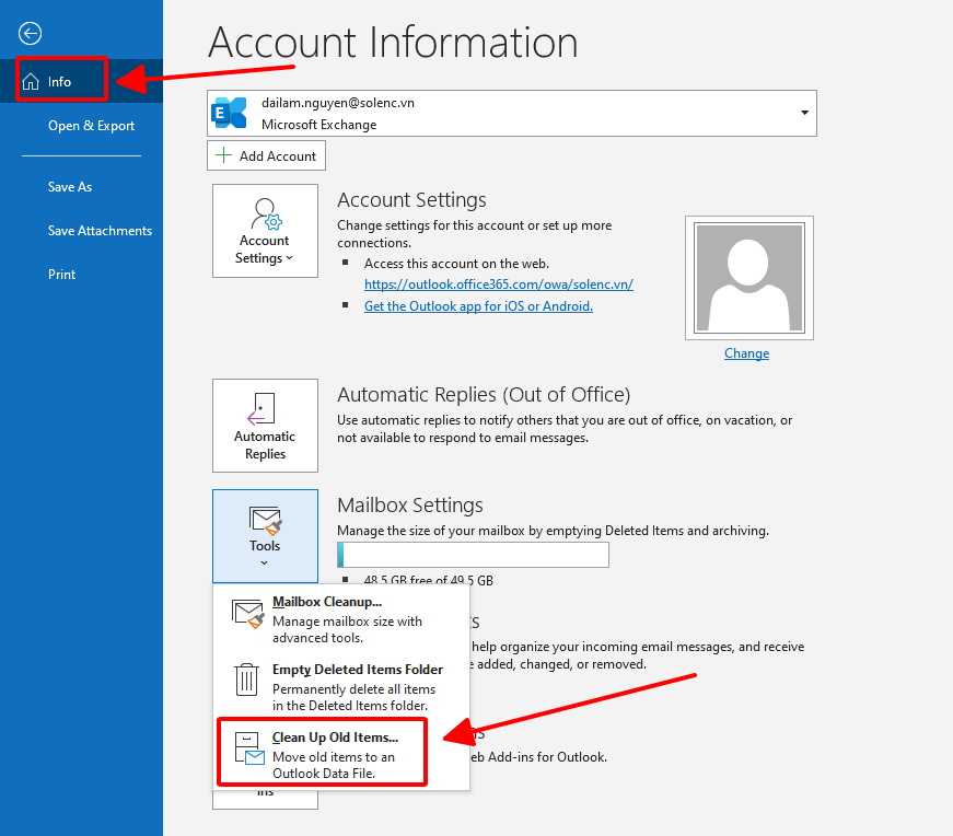 Bước 2: Chọn Info, ở mục Tools chọn Clean Up Old Items...