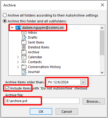 Chọn File > Chọn Info > Ở mục Tools chọn Clean Up Old Items...> Nhấp vào tùy chọn Archive this folder and all subfolders > Chọn thư mục bạn muốn lưu trữ > Nhập ngày mốc lưu trữ > Tích vào ô Include items with “Do not AutoArchive” checked > Nhấn OK.