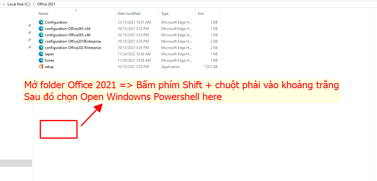 Sau đó paste dòng lệnh này vào: .\setup.exe /configure .\configuration-Office2021Enterprise.xml