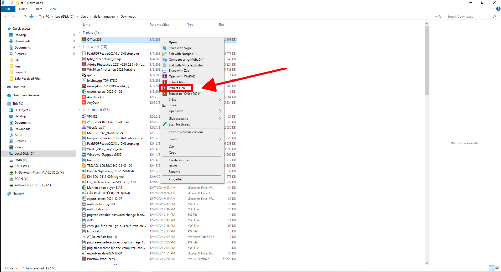 Bấm chuột phải vào folder Office 2021 chọn Extract Here