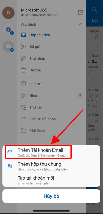 Bước 2: Bấm vào biểu tượng để thêm email => sau đó chọn Thêm Tài Khoản Email